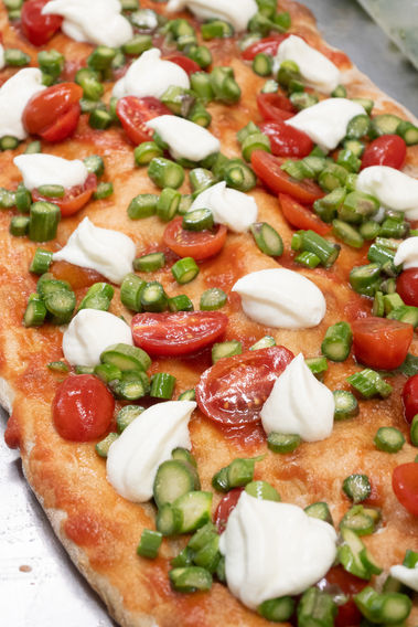 Pomodoro, mozzarella trentina, olive, cipolla di tropea, salamino piccante